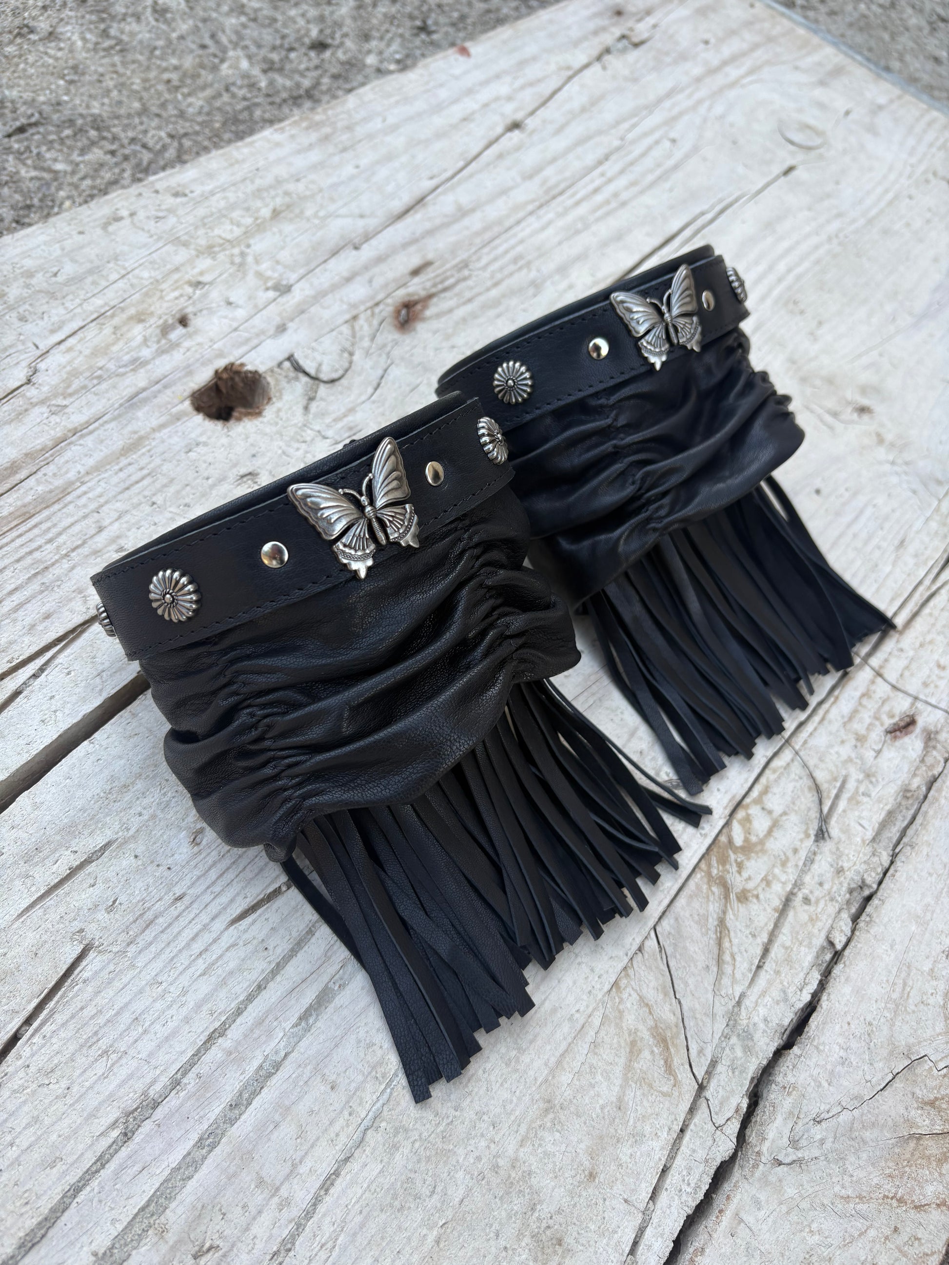 El diseño incluye flecos de piel y detalles metálicos decorativos, que aportan movimiento y carácter. La piel de cordero, especialmente suave y flexible, se adapta con facilidad tanto a la pierna como a la bota base, manteniendo la comodidad.