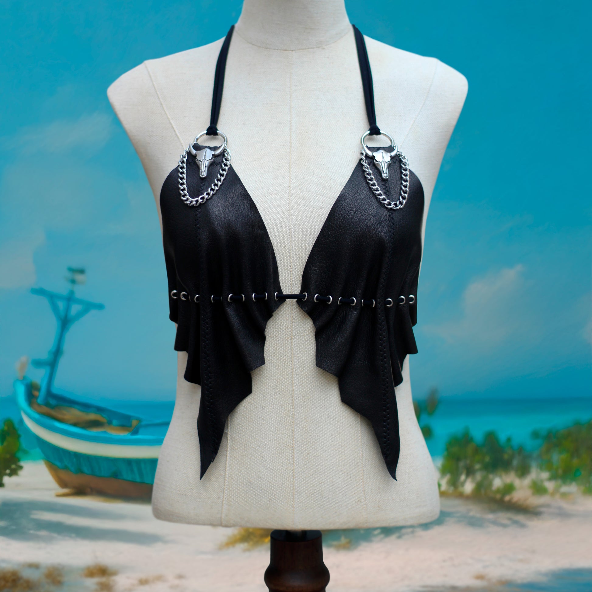 Descubre tu lado más audaz con nuestro top de cuero artesanal estilo boho, una prenda única que combina elegancia rústica con un diseño moderno. Hecho a mano con cuero genuino de cordero color negro obsidiana, este top presenta cortes asimétricos y detalles color plata.