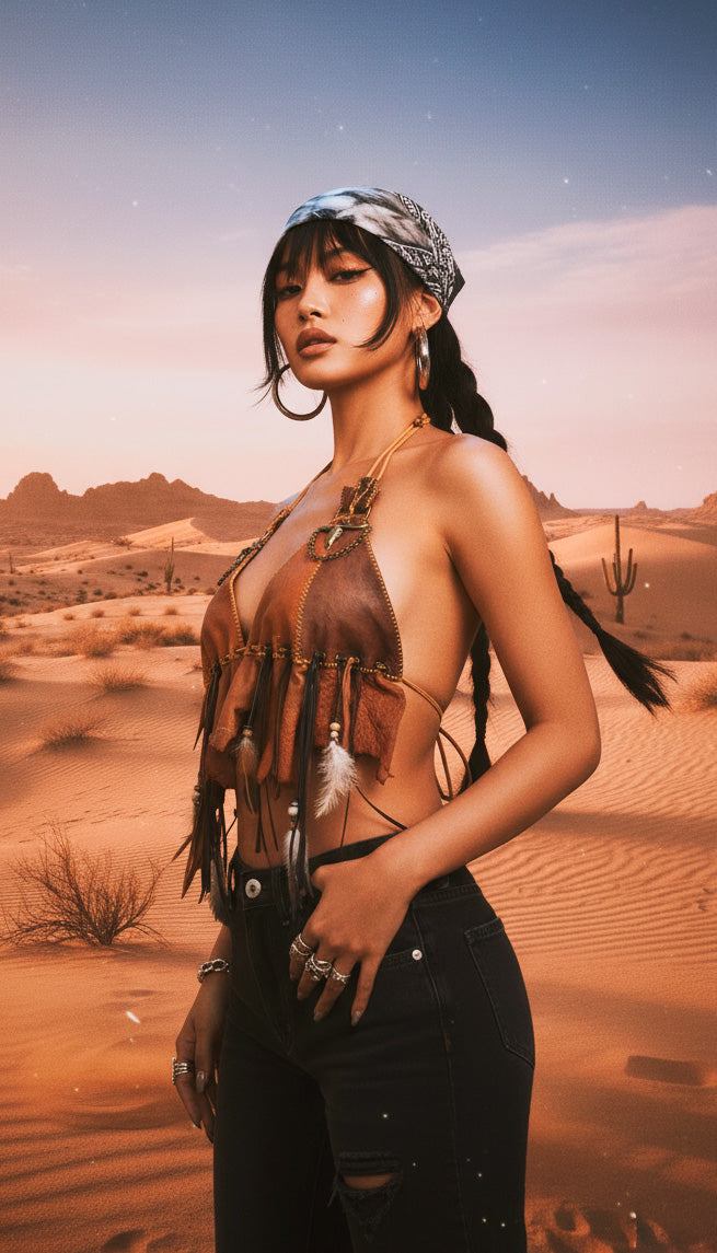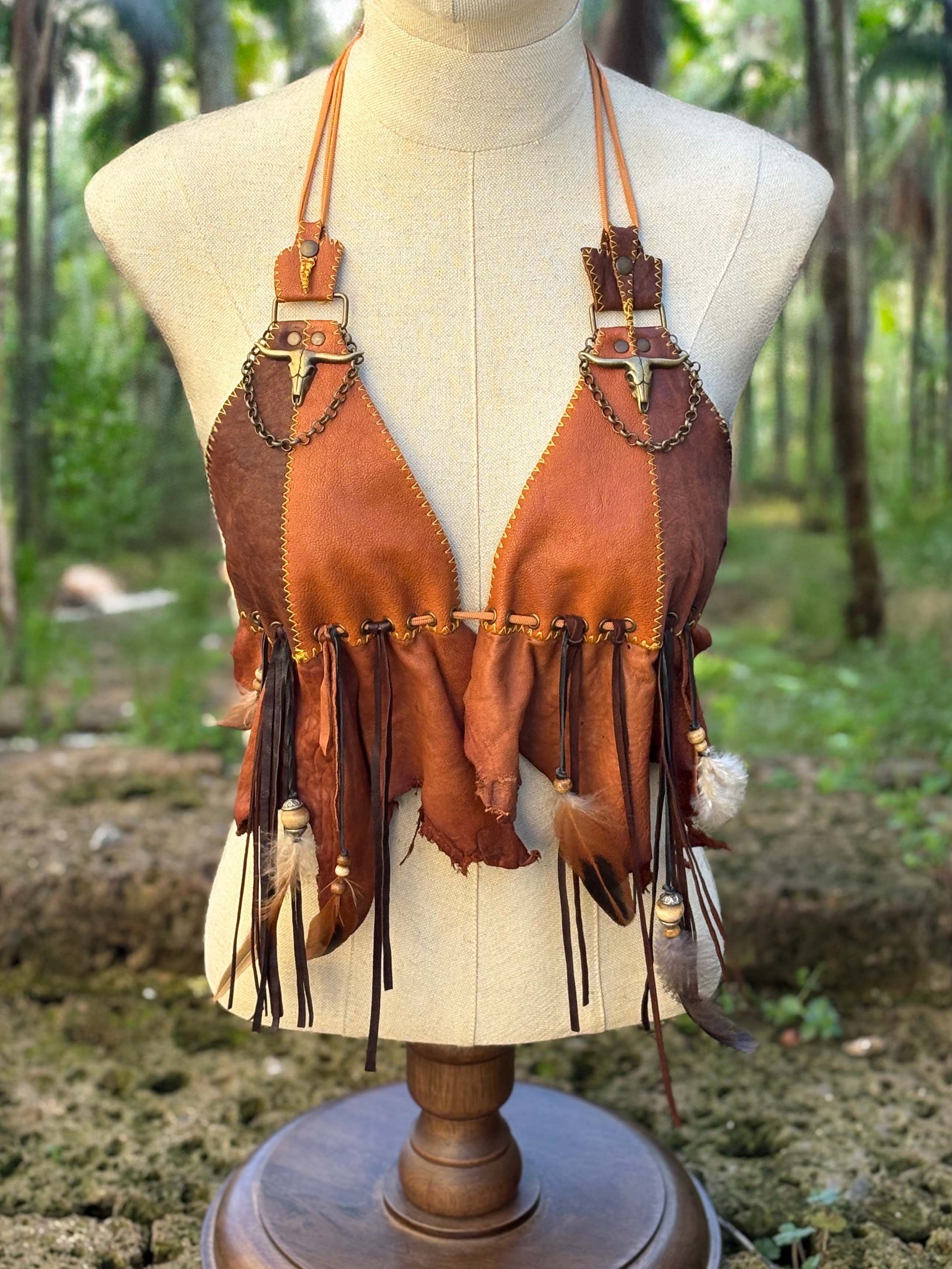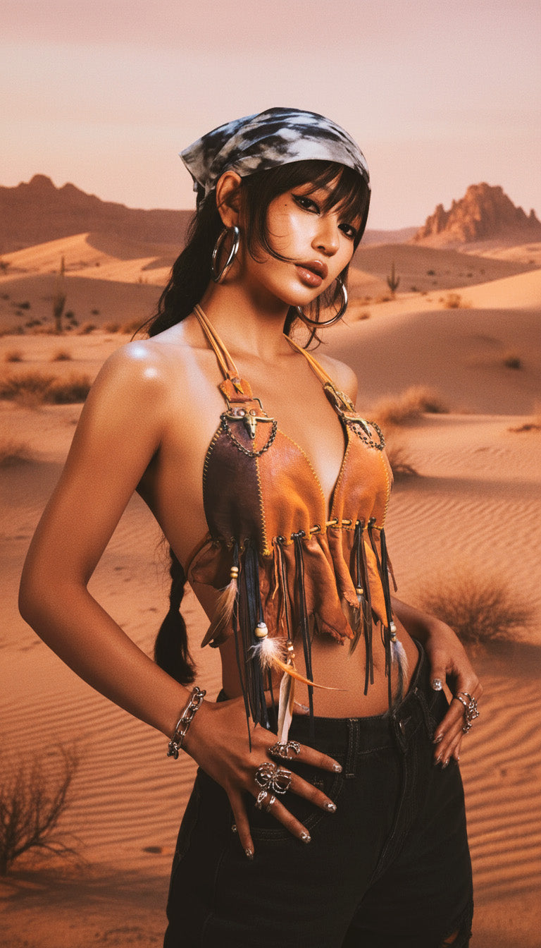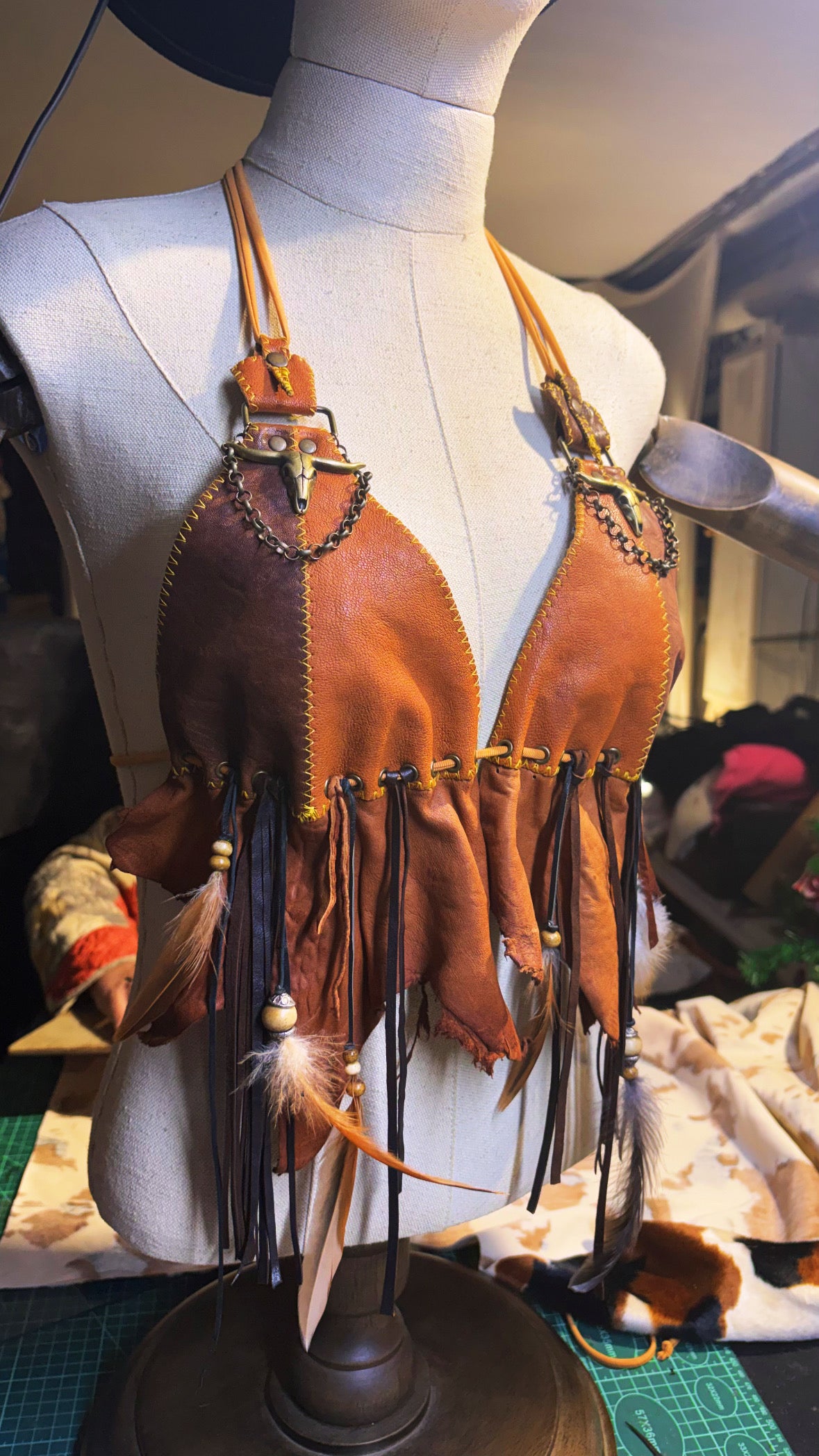 El icónico top de AngelFlame se ha reinterpretado hacia un estilo más wasteland Confeccionado a partir de piezas de cuero en tonos cálidos, presenta costuras vistas y un delicado juego de flecos, plumas y cuentas que aportan movimiento y textura a la silueta.